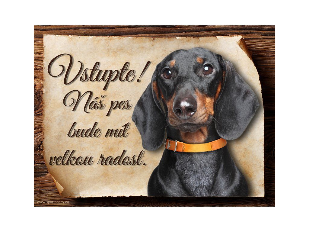 Cedulka Jezevčík černý hladkosrstý , hliníková s nápisem "Vstupte! Náš pes bude mít velkou radost!" Kovová výstražná venkovní cedulka oznamující to či ono, že se ve vašem obydlí může návštěvník setkat s vašim čtyřnohým miláčkem a jeho teritoriem. Velikosti těchto cedulek jsou 15x11,25 a 20x15 cm. Cedulky jsou tištěny sublimační technologií Grawerton přímo na plech. Cedulky dodáváme běžně se zakulacenými rohy. Pokud budete chtít na cedulku vlastní text, napište nám jej do poznámky.