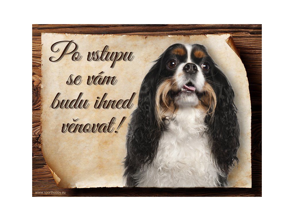 Cedulka s Kavalír King Charles španěl, hliníková s nápisem "Po vstupu se vám budu hned věnovat!" Kovová výstražná venkovní cedulka oznamující to či ono, že se ve vašem obydlí může návštěvník setkat s vašim čtyřnohým miláčkem a jeho teritoriem. Velikosti těchto cedulek jsou 15x11,25 a 20x15 cm. Cedulky jsou tištěny sublimační technologií Grawerton přímo na plech. Cedulky dodáváme běžně se zakulacenými rohy. Pokud budete chtít na cedulku vlastní text, napište nám jej do poznámky.