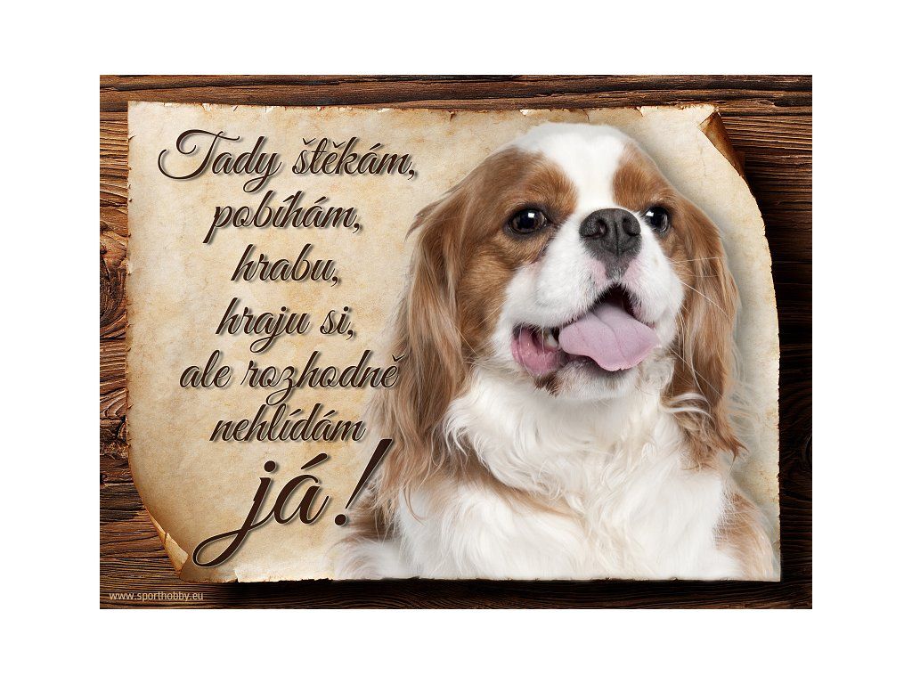 Cedulka Kavalír King Charles španěl, hliníková s nápisem "Tady štěkám, pobíhám, hrabu, hraju si, ale rozhodně nehlídám já!!" Kovová výstražná venkovní cedulka oznamující to či ono, že se ve vašem obydlí může návštěvník setkat s vašim čtyřnohým miláčkem a jeho teritoriem. Velikosti těchto cedulek jsou 15x11,25 a 20x15 cm. Cedulky jsou tištěny sublimační technologií Grawerton přímo na plech. Cedulky dodáváme běžně se zakulacenými rohy. Pokud budete chtít na cedulku vlastní text, napište nám jej do poznámky.