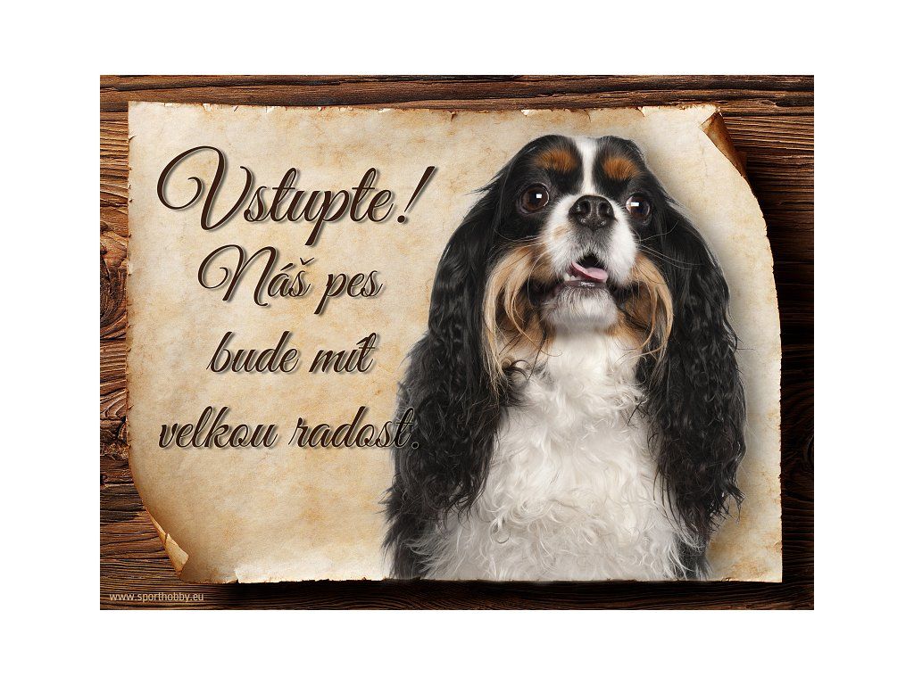 Cedulka Kavalír King Charles španěl, hliníková s nápisem "Vstupte! Náš pes bude mít velkou radost!" Kovová výstražná venkovní cedulka oznamující to či ono, že se ve vašem obydlí může návštěvník setkat s vašim čtyřnohým miláčkem a jeho teritoriem. Velikosti těchto cedulek jsou 15x11,25 a 20x15 cm. Cedulky jsou tištěny sublimační technologií Grawerton přímo na plech. Cedulky dodáváme běžně se zakulacenými rohy. Pokud budete chtít na cedulku vlastní text, napište nám jej do poznámky.