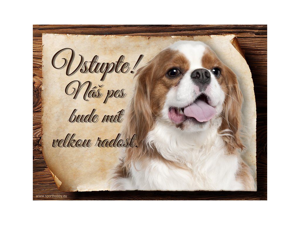 Cedulka Kavalír King Charles španěl, hliníková s nápisem "Vstupte! Náš pes bude mít velkou radost!" Kovová výstražná venkovní cedulka oznamující to či ono, že se ve vašem obydlí může návštěvník setkat s vašim čtyřnohým miláčkem a jeho teritoriem. Velikosti těchto cedulek jsou 15x11,25 a 20x15 cm. Cedulky jsou tištěny sublimační technologií Grawerton přímo na plech. Cedulky dodáváme běžně se zakulacenými rohy. Pokud budete chtít na cedulku vlastní text, napište nám jej do poznámky.