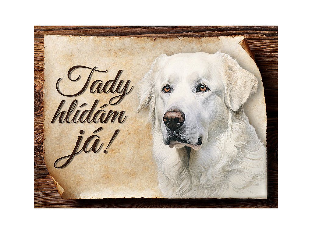 Cedulka s Kuvasz, hliníková s nápisem "Tady hlídám já!" Kovová výstražná venkovní cedulka oznamující to či ono, že se ve vašem obydlí může návštěvník setkat s vašim čtyřnohým miláčkem a jeho teritoriem. Velikosti těchto cedulek jsou 15x11,25 a 20x15 a 27x20 cm. Cedulky jsou tištěny sublimační technologií Grawerton přímo na plech. Cedulky dodáváme běžně se zakulacenými rohy. Pokud budete chtít na cedulku vlastní text, napište nám jej do poznámky.
