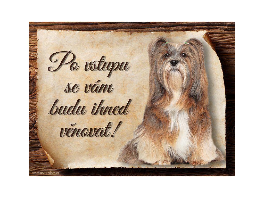 Cedulka s Lhasa Apso, hliníková s nápisem "Po vstupu se vám budu hned věnovat!" Kovová výstražná venkovní cedulka oznamující to či ono, že se ve vašem obydlí může návštěvník setkat s vašim čtyřnohým miláčkem a jeho teritoriem. Velikosti těchto cedulek jsou 15x11,25 a 20x15 cm. Cedulky jsou tištěny sublimační technologií Grawerton přímo na plech. Cedulky dodáváme běžně se zakulacenými rohy. Pokud budete chtít na cedulku vlastní text, napište nám jej do poznámky.