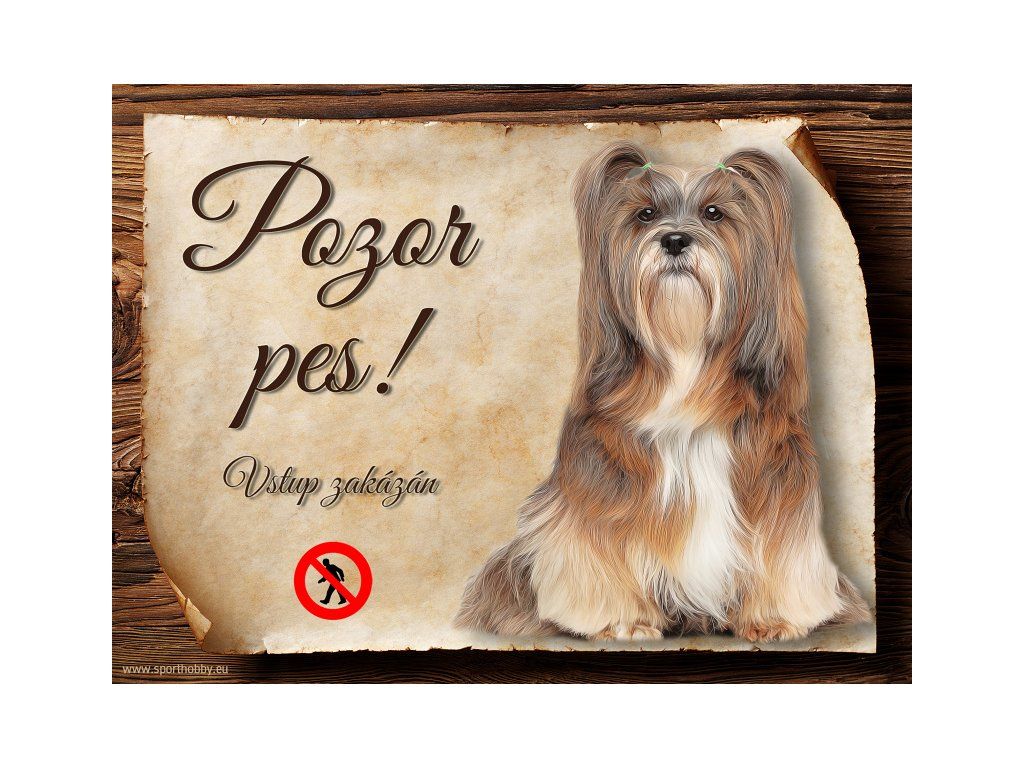 Cedulka s Lhasa Apso, hliníková s nápisem "Pozor pes! Vstup zakázán!" Kovová výstražná venkovní cedulka oznamující to či ono, že se ve vašem obydlí může návštěvník setkat s vašim čtyřnohým miláčkem a jeho teritoriem. Velikosti těchto cedulek jsou 15x11,25 a 20x15 cm. Cedulky jsou tištěny sublimační technologií Grawerton přímo na plech. Cedulky dodáváme běžně se zakulacenými rohy. Pokud budete chtít na cedulku vlastní text, napište nám jej do poznámky.