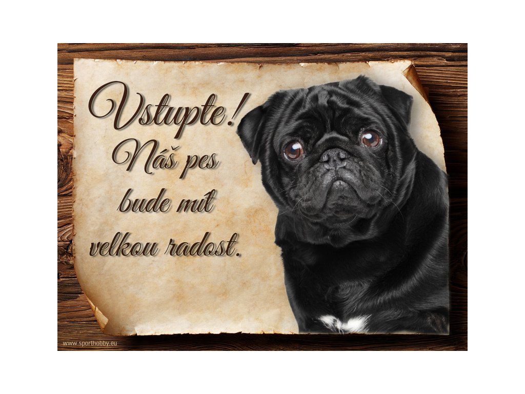 Cedulka Mops II, hliníková s nápisem "Vstupte! Náš pes bude mít velkou radost!" Kovová výstražná venkovní cedulka oznamující to či ono, že se ve vašem obydlí může návštěvník setkat s vašim čtyřnohým miláčkem a jeho teritoriem. Velikosti těchto cedulek jsou 15x11,25 a 20x15 cm. Cedulky jsou tištěny sublimační technologií Grawerton přímo na plech. Cedulky dodáváme běžně se zakulacenými rohy. Pokud budete chtít na cedulku vlastní text, napište nám jej do poznámky.