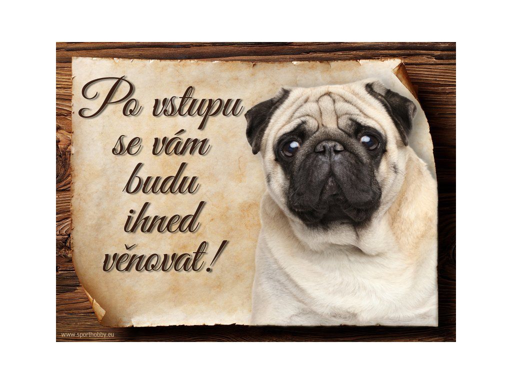 Cedulka Mops, hliníková s nápisem "Po vstupu se vám budu hned věnovat!" Kovová výstražná venkovní cedulka oznamující to či ono, že se ve vašem obydlí může návštěvník setkat s vašim čtyřnohým miláčkem a jeho teritoriem. Velikosti těchto cedulek jsou 15x11,25 a 20x15 cm. Cedulky jsou tištěny sublimační technologií Grawerton přímo na plech. Cedulky dodáváme běžně se zakulacenými rohy. Pokud budete chtít na cedulku vlastní text, napište nám jej do poznámky.
