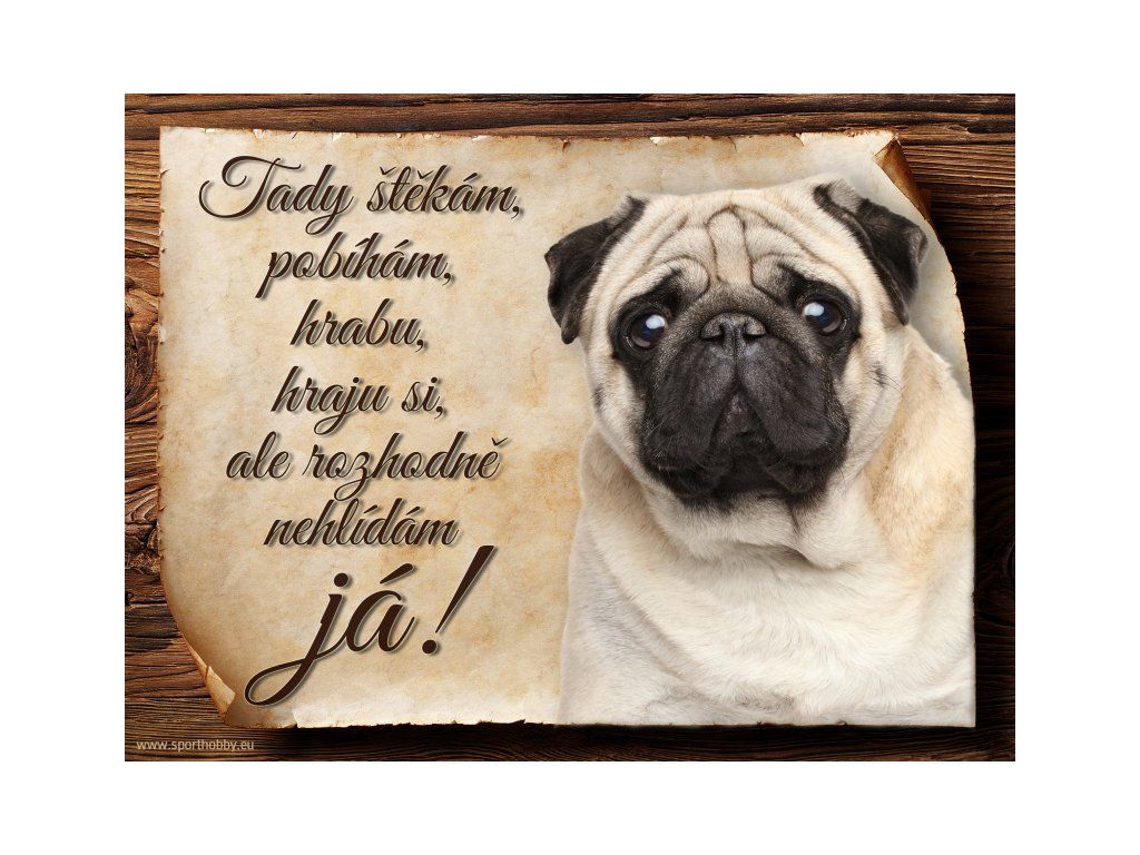 Cedulka Mops, hliníková s nápisem "Tady štěkám, pobíhám, hrabu, hraju si, ale rozhodně nehlídám já!!" Kovová výstražná venkovní cedulka oznamující to či ono, že se ve vašem obydlí může návštěvník setkat s vašim čtyřnohým miláčkem a jeho teritoriem. Velikosti těchto cedulek jsou 15x11,25 a 20x15 cm. Cedulky jsou tištěny sublimační technologií Grawerton přímo na plech. Cedulky dodáváme běžně se zakulacenými rohy. Pokud budete chtít na cedulku vlastní text, napište nám jej do poznámky.