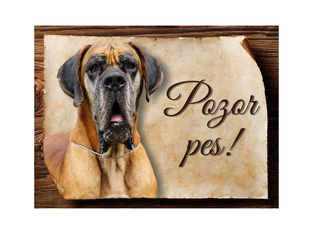 Cedulka Německá doga hliníková s nápisem "Pozor pes!" Kovová výstražná venkovní cedulka oznamující to či ono, že se ve vašem obydlí může návštěvník setkat s vašim čtyřnohým miláčkem a jeho teritoriem. Velikosti těchto cedulek jsou 15x11,25 a 20x15 cm. Cedulky jsou tištěny sublimační technologií Grawerton přímo na plech. Cedulky dodáváme běžně se zakulacenými rohy. Pokud budete chtít na cedulku vlastní text, napište nám jej do poznámky.