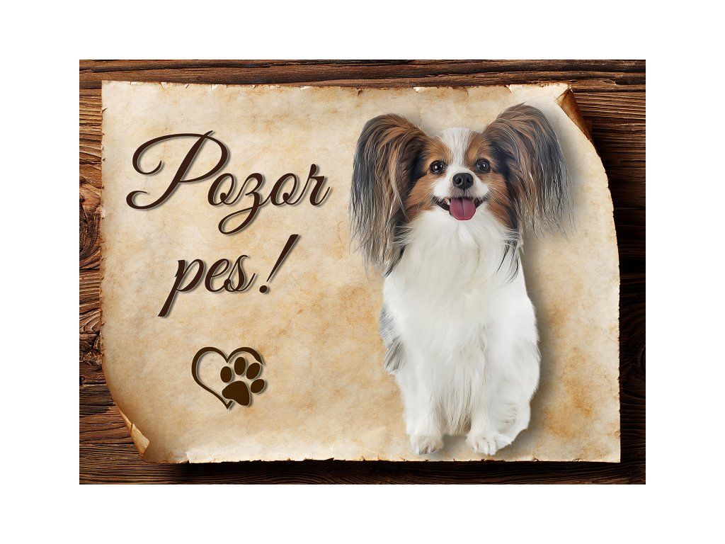 Cedulka Papilon, hliníková s nápisem "Pozor pes!" Kovová výstražná venkovní cedulka oznamující to či ono, že se ve vašem obydlí může návštěvník setkat s vašim čtyřnohým miláčkem a jeho teritoriem. Velikosti těchto cedulek jsou 15x11,25 a 20x15 cm. Cedulky jsou tištěny sublimační technologií Grawerton přímo na plech. Cedulky dodáváme běžně se zakulacenými rohy. Pokud budete chtít na cedulku vlastní text, napište nám jej do poznámky.