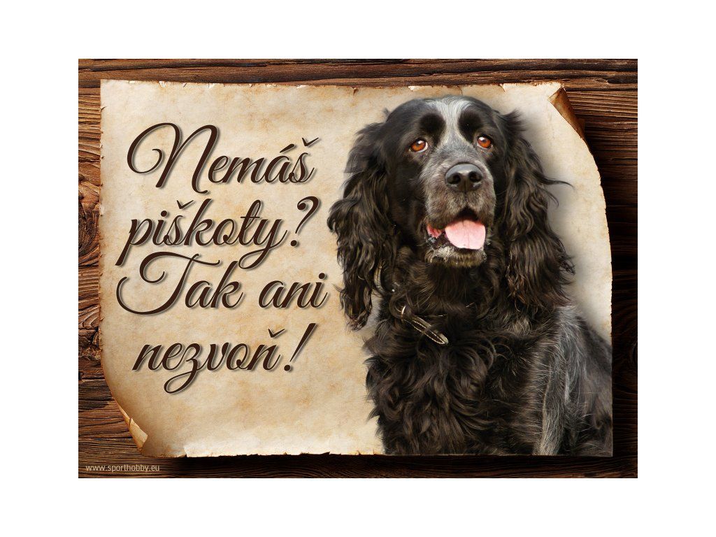 Cedulka Pikardský ohař, hliníková s nápisem "Nemáš piškoty? Tak ani nezvoň!" Kovová výstražná venkovní cedulka oznamující to či ono, že se ve vašem obydlí může návštěvník setkat s vašim čtyřnohým miláčkem a jeho teritoriem. Velikosti těchto cedulek jsou 15x11,25 a 20x15 cm. Cedulky jsou tištěny sublimační technologií Grawerton přímo na plech. Cedulky dodáváme běžně se zakulacenými rohy. Pokud budete chtít na cedulku vlastní text, napište nám jej do poznámky.