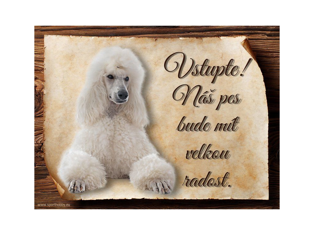 Cedulka s Pudl I, hliníková s nápisem "Vstupte! Náš pes bude mít velkou radost!" Kovová výstražná venkovní tabulka oznamující to či ono, že se ve vašem obydlí může návštěvník setkat s vašim čtyřnohým miláčkem a jeho teritoriem. Velikosti těchto cedulek jsou 15x11,25 a 20x15 cm. Cedulky jsou tištěny sublimační technologií Grawerton přímo na plech. Cedulky dodáváme běžně se zakulacenými rohy. Pokud budete chtít na cedulku vlastní text, napište nám jej do poznámky.