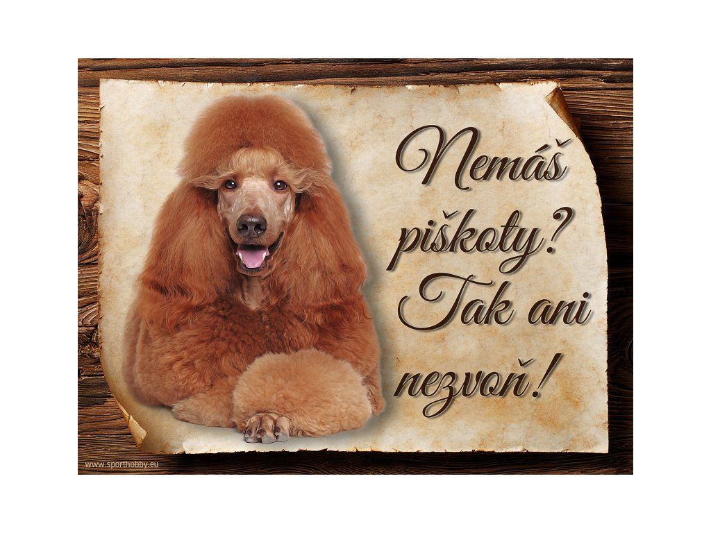 Cedulka s Pudl II, hliníková s nápisem "Nemáš piškoty? Tak ani nezvoň!" Kovová výstražná venkovní cedulka oznamující to či ono, že se ve vašem obydlí může návštěvník setkat s vašim čtyřnohým miláčkem a jeho teritoriem. Velikosti těchto cedulek jsou 15x11,25 a 20x15 cm. Cedulky jsou tištěny sublimační technologií Grawerton přímo na plech. Cedulky dodáváme běžně se zakulacenými rohy. Pokud budete chtít na cedulku vlastní text, napište nám jej do poznámky.