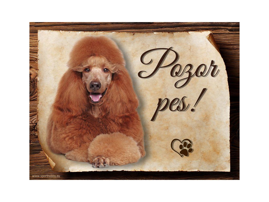 Cedulka s Pudl II, hliníková s nápisem "Pozor pes!" Kovová výstražná venkovní cedulka oznamující to či ono, že se ve vašem obydlí může návštěvník setkat s vašim čtyřnohým miláčkem a jeho teritoriem. Velikosti těchto cedulek jsou 15x11,25 a 20x15 cm. Cedulky jsou tištěny sublimační technologií Grawerton přímo na plech. Cedulky dodáváme běžně se zakulacenými rohy. Pokud budete chtít na cedulku vlastní text, napište nám jej do poznámky.