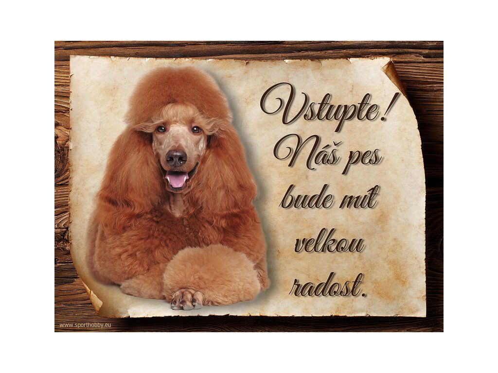 Cedulka s Pudl II, hliníková s nápisem "Vstupte! Náš pes bude mít velkou radost!" Kovová výstražná venkovní tabulka oznamující to či ono, že se ve vašem obydlí může návštěvník setkat s vašim čtyřnohým miláčkem a jeho teritoriem. Velikosti těchto cedulek jsou 15x11,25 a 20x15 cm. Cedulky jsou tištěny sublimační technologií Grawerton přímo na plech. Cedulky dodáváme běžně se zakulacenými rohy. Pokud budete chtít na cedulku vlastní text, napište nám jej do poznámky.