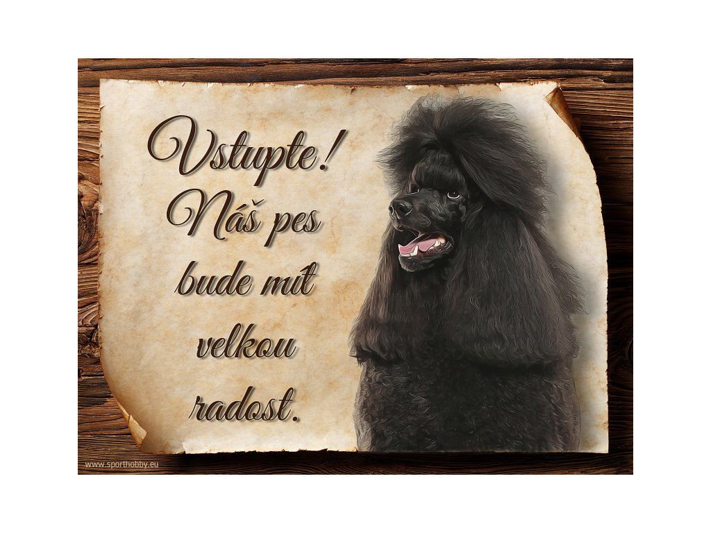 Cedulka s Pudl III, hliníková s nápisem "Vstupte! Náš pes bude mít velkou radost!" Kovová výstražná venkovní tabulka oznamující to či ono, že se ve vašem obydlí může návštěvník setkat s vašim čtyřnohým miláčkem a jeho teritoriem. Velikosti těchto cedulek jsou 15x11,25 a 20x15 cm. Cedulky jsou tištěny sublimační technologií Grawerton přímo na plech. Cedulky dodáváme běžně se zakulacenými rohy. Pokud budete chtít na cedulku vlastní text, napište nám jej do poznámky.