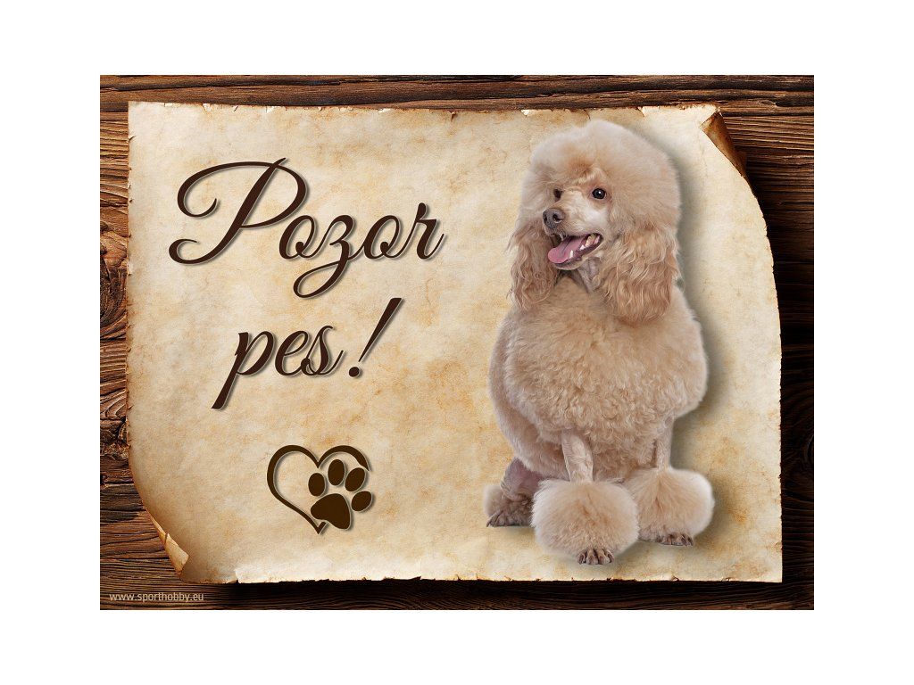 Cedulka s Pudl IV, hliníková s nápisem "Pozor pes!" Kovová výstražná venkovní cedulka oznamující to či ono, že se ve vašem obydlí může návštěvník setkat s vašim čtyřnohým miláčkem a jeho teritoriem. Velikosti těchto cedulek jsou 15x11,25 a 20x15 cm. Cedulky jsou tištěny sublimační technologií Grawerton přímo na plech. Cedulky dodáváme běžně se zakulacenými rohy. Pokud budete chtít na cedulku vlastní text, napište nám jej do poznámky.