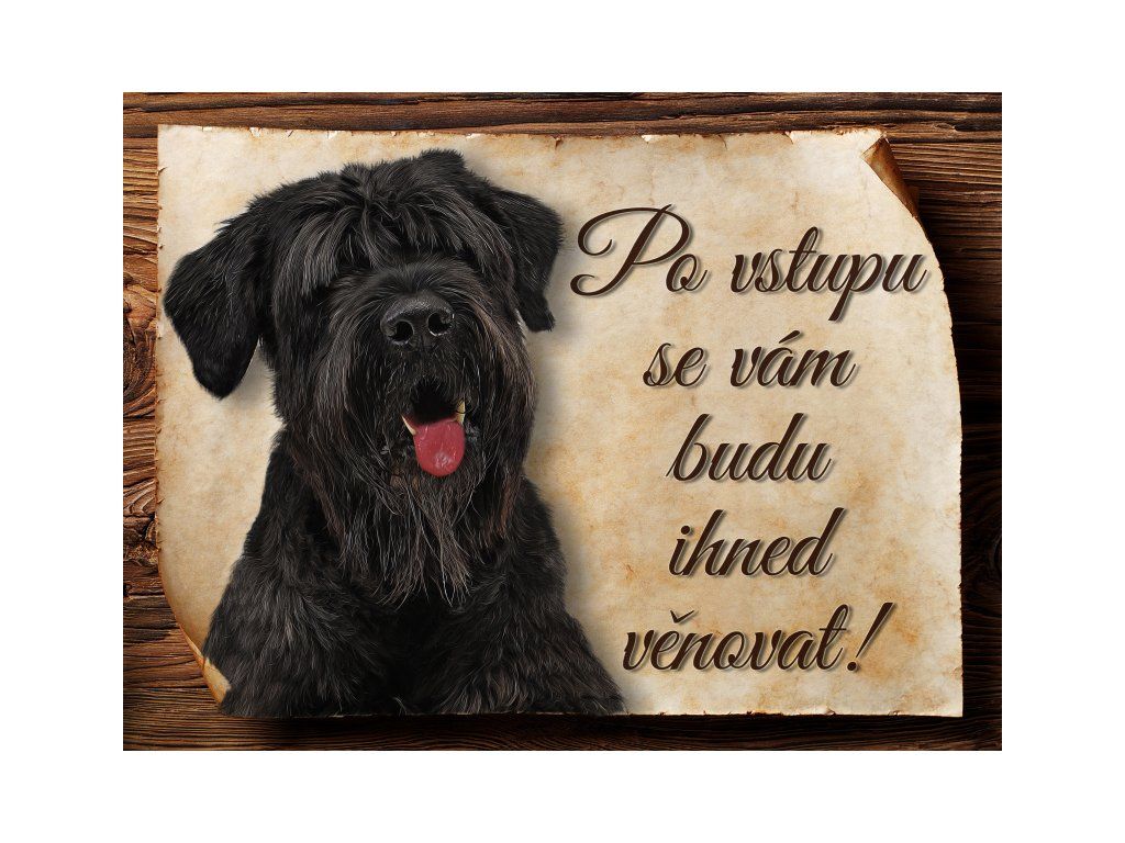 Cedulka Ruský černý teriér hliníková s nápisem "Po vstupu se vám budu hned věnovat!" Kovová výstražná venkovní cedulka oznamující to či ono, že se ve vašem obydlí může návštěvník setkat s vašim čtyřnohým miláčkem a jeho teritoriem. Velikosti těchto cedulek jsou 15x11,25 a 20x15 cm. Cedulky jsou tištěny sublimační technologií Grawerton přímo na plech. Cedulky dodáváme běžně se zakulacenými rohy. Pokud budete chtít na cedulku vlastní text, napište nám jej do poznámky.