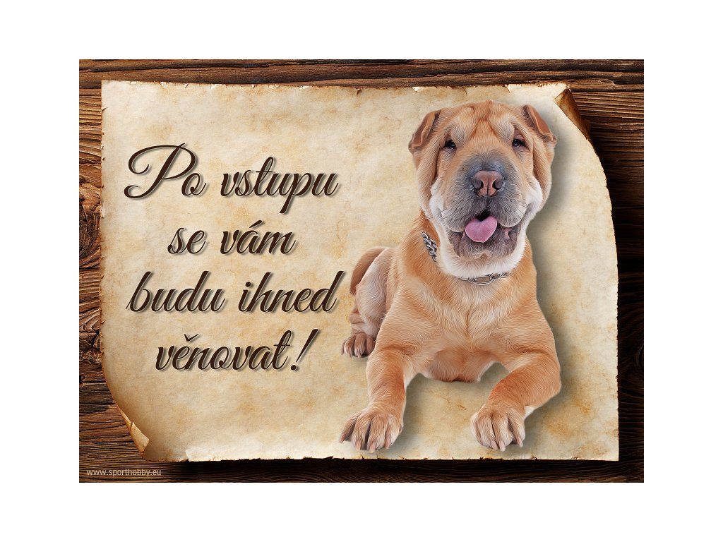 Cedulka s Šarpej, hliníková s nápisem "Po vstupu se vám budu hned věnovat!" Kovová výstražná venkovní cedulka oznamující to či ono, že se ve vašem obydlí může návštěvník setkat s vašim čtyřnohým miláčkem a jeho teritoriem. Velikosti těchto cedulek jsou 15x11,25 a 20x15 cm. Cedulky jsou tištěny sublimační technologií Grawerton přímo na plech. Cedulky dodáváme běžně se zakulacenými rohy. Pokud budete chtít na cedulku vlastní text, napište nám jej do poznámky.