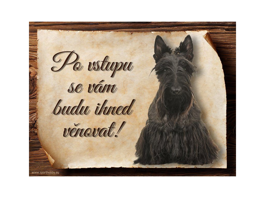 Cedulka s Skotský teriér, hliníková s nápisem "Po vstupu se vám budu hned věnovat!" Kovová výstražná venkovní cedulka oznamující to či ono, že se ve vašem obydlí může návštěvník setkat s vašim čtyřnohým miláčkem a jeho teritoriem. Velikosti těchto cedulek jsou 15x11,25 a 20x15 cm. Cedulky jsou tištěny sublimační technologií Grawerton přímo na plech. Cedulky dodáváme běžně se zakulacenými rohy. Pokud budete chtít na cedulku vlastní text, napište nám jej do poznámky.