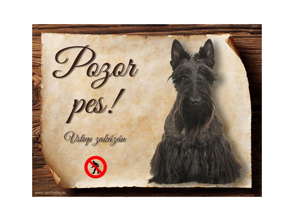 Cedulka s Skotský teriér, hliníková s nápisem "Pozor pes! Vstup zakázán!" Kovová výstražná venkovní cedulka oznamující to či ono, že se ve vašem obydlí může návštěvník setkat s vašim čtyřnohým miláčkem a jeho teritoriem. Velikosti těchto cedulek jsou 15x11,25 a 20x15 cm. Cedulky jsou tištěny sublimační technologií Grawerton přímo na plech. Cedulky dodáváme běžně se zakulacenými rohy. Pokud budete chtít na cedulku vlastní text, napište nám jej do poznámky.