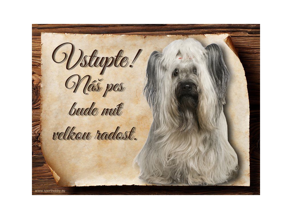 Cedulka Skye teriér, hliníková s nápisem "Vstupte! Náš pes bude mít velkou radost!" Kovová výstražná venkovní cedulka oznamující to či ono, že se ve vašem obydlí může návštěvník setkat s vašim čtyřnohým miláčkem a jeho teritoriem. Velikosti těchto cedulek jsou 15x11,25 a 20x15 cm. Cedulky jsou tištěny sublimační technologií Grawerton přímo na plech. Cedulky dodáváme běžně se zakulacenými rohy. Pokud budete chtít na cedulku vlastní text, napište nám jej do poznámky.