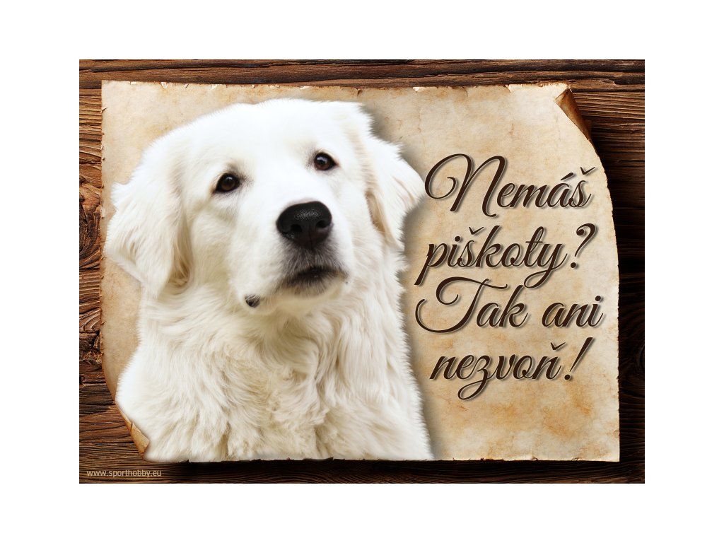 Cedulka Slovenský čuvač, hliníková s nápisem "Nemáš piškoty? Tak ani nezvoň!" Kovová výstražná venkovní cedulka oznamující to či ono, že se ve vašem obydlí může návštěvník setkat s vašim čtyřnohým miláčkem a jeho teritoriem. Velikosti těchto cedulek jsou 15x11,25 a 20x15 cm. Cedulky jsou tištěny sublimační technologií Grawerton přímo na plech. Cedulky dodáváme běžně se zakulacenými rohy. Pokud budete chtít na cedulku vlastní text, napište nám jej do poznámky.
