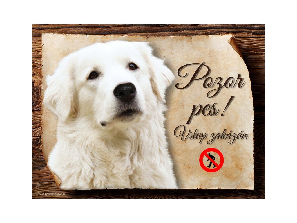 Cedulka Slovenský čuvač hliníková s nápisem "Pozor pes! Vstup zakázán." Kovová výstražná venkovní cedulka oznamující to či ono, že se ve vašem obydlí může návštěvník setkat s vašim čtyřnohým miláčkem a jeho teritoriem. Velikosti těchto cedulek jsou 15x11,25 a 20x15 cm. Cedulky jsou tištěny sublimační technologií Grawerton přímo na plech. Cedulky dodáváme běžně se zakulacenými rohy. Pokud budete chtít na cedulku vlastní text, napište nám jej do poznámky.