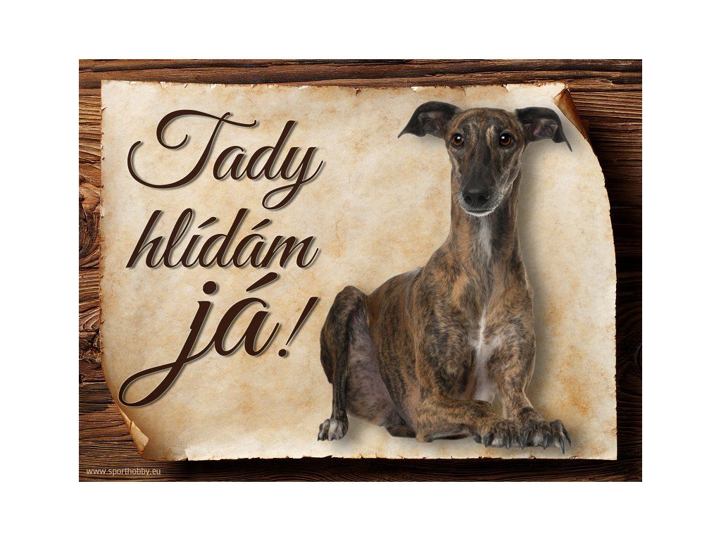 Cedulka s Španělský chrt, hliníková s nápisem "Tady hlídám já!" Kovová výstražná venkovní cedulka oznamující to či ono, že se ve vašem obydlí může návštěvník setkat s vašim čtyřnohým miláčkem a jeho teritoriem. Velikosti těchto cedulek jsou 15x11,25 a 20x15 cm. Cedulky jsou tištěny sublimační technologií Grawerton přímo na plech. Cedulky dodáváme běžně se zakulacenými rohy. Pokud budete chtít na cedulku vlastní text, napište nám jej do poznámky.