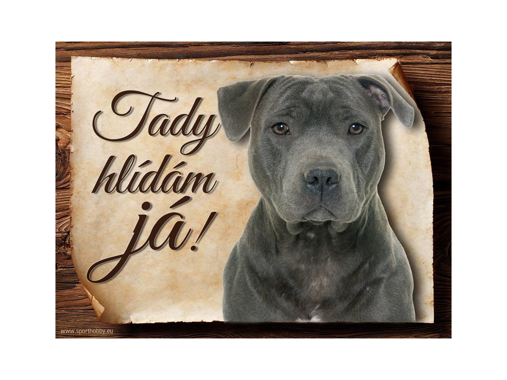 Cedulka Stafordširský bulteriér II, hliníková s nápisem "Tady hlídám já!" Kovová výstražná venkovní cedulka oznamující to či ono, že se ve vašem obydlí může návštěvník setkat s vašim čtyřnohým miláčkem a jeho teritoriem. Velikosti těchto cedulek jsou 15x11,25 a 20x15 cm. Cedulky jsou tištěny sublimační technologií Grawerton přímo na plech. Cedulky dodáváme běžně se zakulacenými rohy. Pokud budete chtít na cedulku vlastní text, napište nám jej do poznámky.