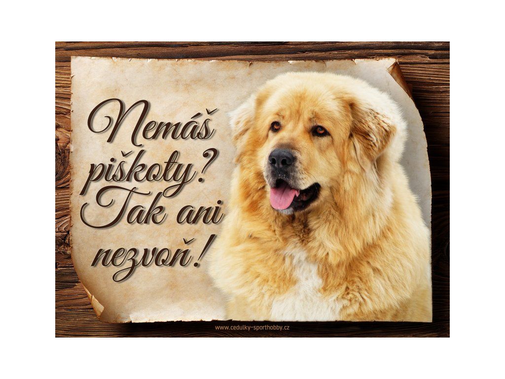 Cedulka Tibetská doga, hliníková s nápisem "Nemáš piškoty? Tak ani nezvoň!" Kovová výstražná venkovní cedulka oznamující to či ono, že se ve vašem obydlí může návštěvník setkat s vašim čtyřnohým miláčkem a jeho teritoriem. Velikosti těchto cedulek jsou 15x11,25 a 20x15 cm. Cedulky jsou tištěny sublimační technologií Grawerton přímo na plech. Cedulky dodáváme běžně se zakulacenými rohy. Pokud budete chtít na cedulku vlastní text, napište nám jej do poznámky.
