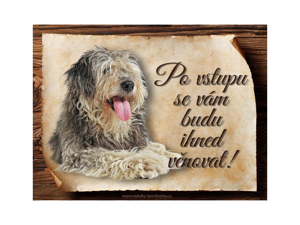 Cedulka s Tibetský teriér I., hliníková s nápisem "Po vstupu se vám budu hned věnovat!" Kovová výstražná venkovní cedulka oznamující to či ono, že se ve vašem obydlí může návštěvník setkat s vašim čtyřnohým miláčkem a jeho teritoriem. Velikosti těchto cedulek jsou 15x11,25 a 20x15 cm. Cedulky jsou tištěny sublimační technologií Grawerton přímo na plech. Cedulky dodáváme běžně se zakulacenými rohy. Pokud budete chtít na cedulku vlastní text, napište nám jej do poznámky.