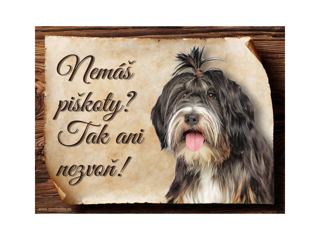 Cedulka s Tibetský teriér, hliníková s nápisem "Nemáš piškoty? Tak ani nezvoň!" Kovová výstražná venkovní cedulka oznamující to či ono, že se ve vašem obydlí může návštěvník setkat s vašim čtyřnohým miláčkem a jeho teritoriem. Velikosti těchto cedulek jsou 15x11,25 a 20x15 cm. Cedulky jsou tištěny sublimační technologií Grawerton přímo na plech. Cedulky dodáváme běžně se zakulacenými rohy. Pokud budete chtít na cedulku vlastní text, napište nám jej do poznámky.