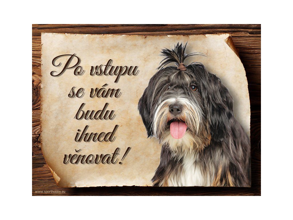 Cedulka s Tibetský teriér, hliníková s nápisem "Po vstupu se vám budu hned věnovat!" Kovová výstražná venkovní cedulka oznamující to či ono, že se ve vašem obydlí může návštěvník setkat s vašim čtyřnohým miláčkem a jeho teritoriem. Velikosti těchto cedulek jsou 15x11,25 a 20x15 cm. Cedulky jsou tištěny sublimační technologií Grawerton přímo na plech. Cedulky dodáváme běžně se zakulacenými rohy. Pokud budete chtít na cedulku vlastní text, napište nám jej do poznámky.