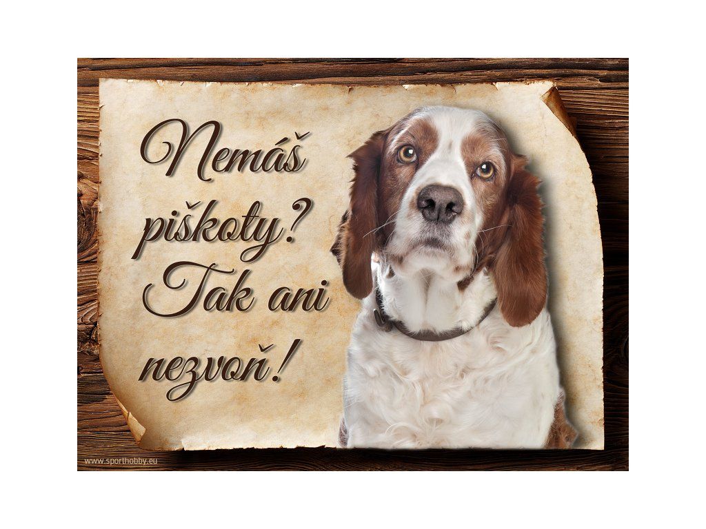 Cedulka Velššpringršpaněl, hliníková s nápisem "Nemáš piškoty? Tak ani nezvoň!" Kovová výstražná venkovní cedulka oznamující to či ono, že se ve vašem obydlí může návštěvník setkat s vašim čtyřnohým miláčkem a jeho teritoriem. Velikosti těchto cedulek jsou 15x11,25 a 20x15 cm. Cedulky jsou tištěny sublimační technologií Grawerton přímo na plech. Cedulky dodáváme běžně se zakulacenými rohy. Pokud budete chtít na cedulku vlastní text, napište nám jej do poznámky.