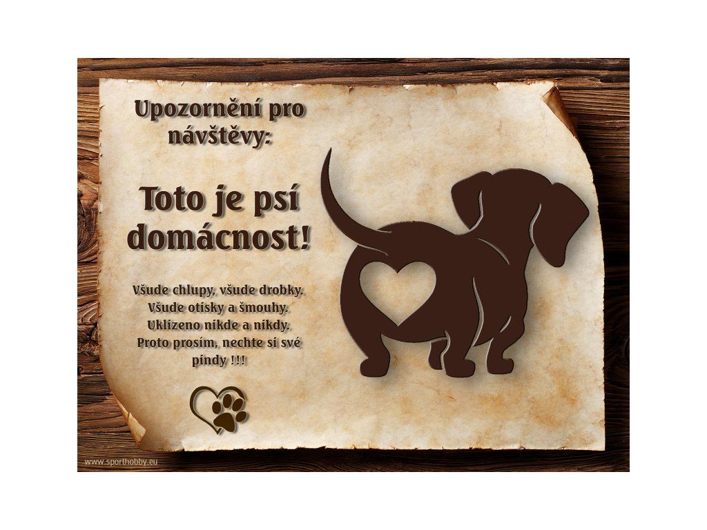 Vtipná cedulka s nápisem. Kovová výstražná venkovní cedulka oznamující to či ono, že se ve vašem obydlí může návštěvník setkat s vašim čtyřnohým miláčkem a jeho teritoriem. Velikosti těchto cedulek jsou 15x11,25 a 20x15 a 26,7x20 cm. Cedulky jsou tištěny sublimační technologií Grawerton přímo na plech. Cedulky dodáváme běžně se zakulacenými rohy. Pokud budete chtít na cedulku vlastní text, napište nám jej do poznámky. Zde můžete objednávat cedulku s motivem vašeho psa. Fotografii pošlete e-mailem s číslem objednávky. Fotografie zasílejte ve formátu JPG, PDF, TIF apod. pokud možno v lepší kvalitě. Úpravu - "vyříznutí" z pozadí můžete nechat na nás.