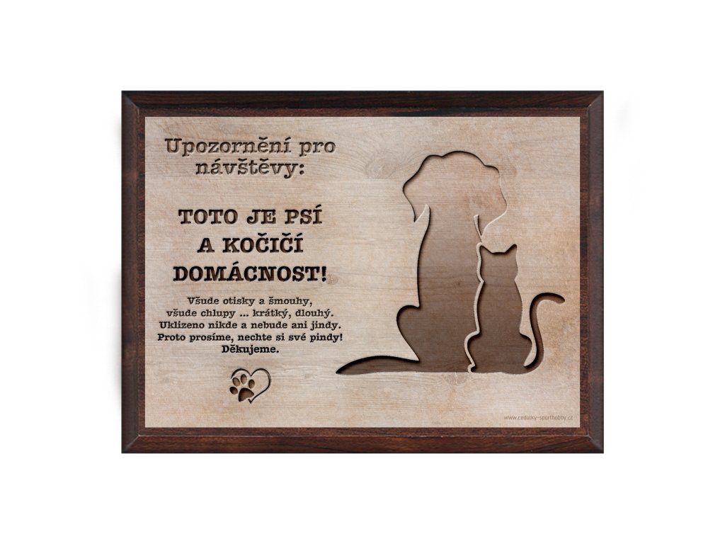 Vtipná cedulka s nápisem "Psí a kočičí domácnost ...". Kovová cedulka umístěná na MDF podložce v provedení tmavý ořech vhodná k postavení na stojánek a nebo k pověšení. Velikosti této plakety je 20x15x1,5 cm. Cedulky jsou tištěny sublimační technologií Grawerton přímo na plech.