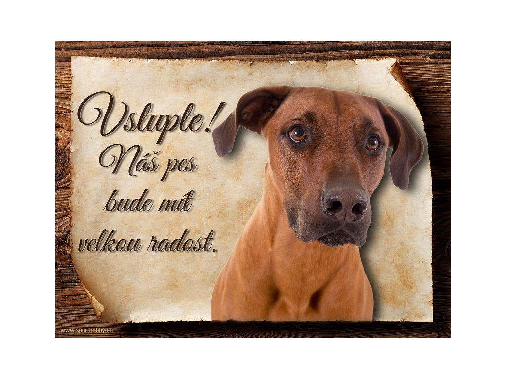 Cedulka s Rhodéským ridgebackem, hliníková s nápisem "Vstupte! Náš pes bude mít velkou radost!" Kovová výstražná venkovní tabulka oznamující to či ono, že se ve vašem obydlí může návštěvník setkat s vašim čtyřnohým miláčkem a jeho teritoriem. Velikosti těchto cedulek jsou 15x11,25 a 20x15 cm. Cedulky jsou tištěny sublimační technologií Grawerton přímo na plech. Cedulky dodáváme běžně se zakulacenými rohy. Pokud budete chtít na cedulku vlastní text, napište nám jej do poznámky.