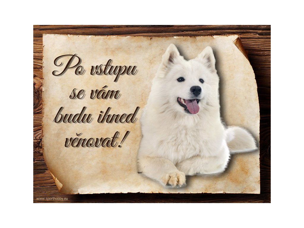 Cedulka Samojed, hliníková s nápisem "Po vstupu se vám budu hned věnovat!" Kovová výstražná venkovní cedulka oznamující to či ono, že se ve vašem obydlí může návštěvník setkat s vašim čtyřnohým miláčkem a jeho teritoriem. Velikosti těchto cedulek jsou 15x11,25 a 20x15 cm. Cedulky jsou tištěny sublimační technologií Grawerton přímo na plech. Cedulky dodáváme běžně se zakulacenými rohy. Pokud budete chtít na cedulku vlastní text, napište nám jej do poznámky.