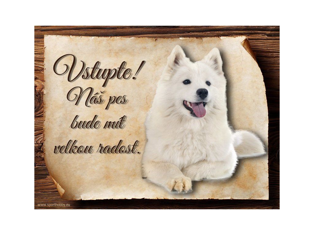Cedulka Samojed, hliníková s nápisem "Vstupte! Náš pes bude mít velkou radost!" Kovová výstražná venkovní cedulka oznamující to či ono, že se ve vašem obydlí může návštěvník setkat s vašim čtyřnohým miláčkem a jeho teritoriem. Velikosti těchto cedulek jsou 15x11,25 a 20x15 cm. Cedulky jsou tištěny sublimační technologií Grawerton přímo na plech. Cedulky dodáváme běžně se zakulacenými rohy. Pokud budete chtít na cedulku vlastní text, napište nám jej do poznámky.