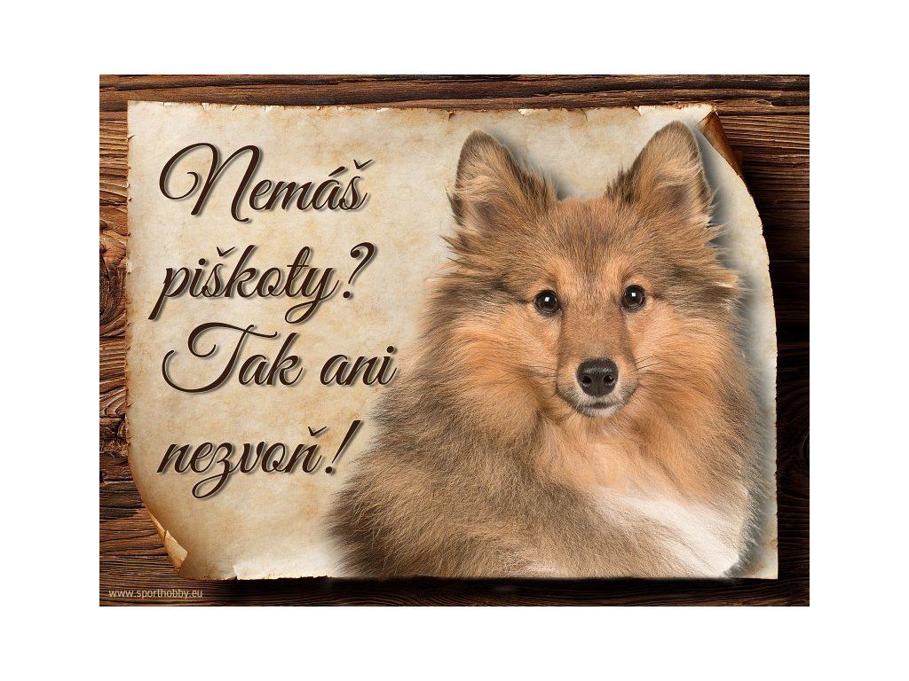 Cedulka Šeltie, hliníková s nápisem "Nemáš piškoty? Tak ani nezvoň!" Kovová výstražná venkovní cedulka oznamující to či ono, že se ve vašem obydlí může návštěvník setkat s vašim čtyřnohým miláčkem a jeho teritoriem. Velikosti těchto cedulek jsou 15x11,25 a 20x15 cm. Cedulky jsou tištěny sublimační technologií Grawerton přímo na plech. Cedulky dodáváme běžně se zakulacenými rohy. Pokud budete chtít na cedulku vlastní text, napište nám jej do poznámky.