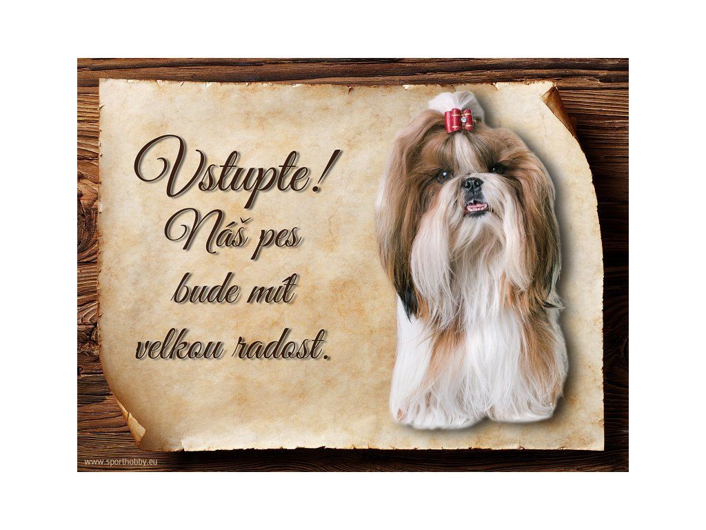 Cedulka Shih-tzu, hliníková s nápisem "Vstupte! Náš pes bude mít velkou radost!" Kovová výstražná venkovní tabulka oznamující to či ono, že se ve vašem obydlí může návštěvník setkat s vašim čtyřnohým miláčkem a jeho teritoriem. Velikosti těchto cedulek jsou 15x11,25 a 20x15 cm. Cedulky jsou tištěny sublimační technologií Grawerton přímo na plech. Cedulky dodáváme běžně se zakulacenými rohy. Pokud budete chtít na cedulku vlastní text, napište nám jej do poznámky.