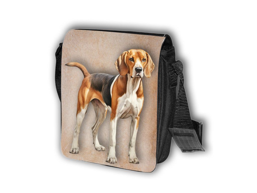 Nylonová vycházková taška s popruhem přes rameno, černé barvy. Velikost tašky je 21x20 cm. Na omyvatelné, odnímatelné ploše velikosti 17x20 cm je krásný paint potisk Americký foxhound