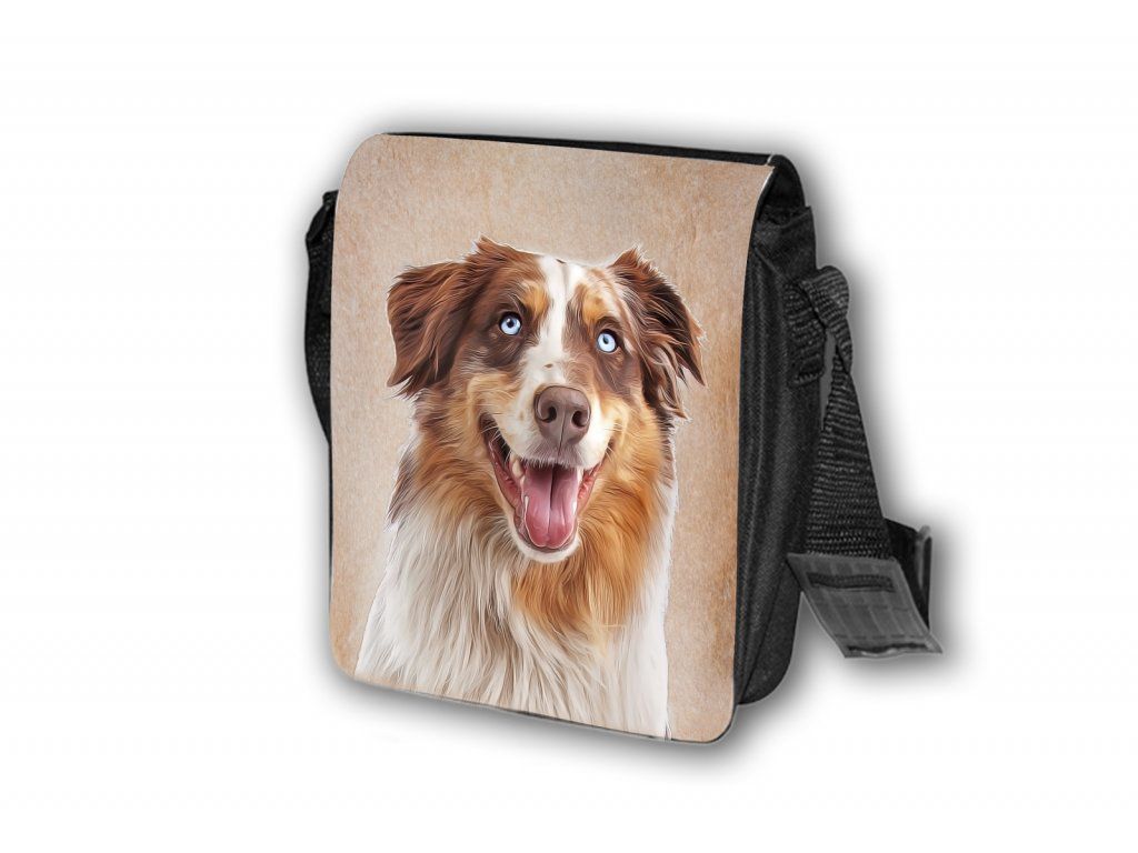 Nylonová vycházková taška s popruhem přes rameno, černé barvy. Velikost tašky je 21x20 cm. Na omyvatelné, odnímatelné ploše velikosti 17x20 cm je krásný paint potisk Australský ovčák.