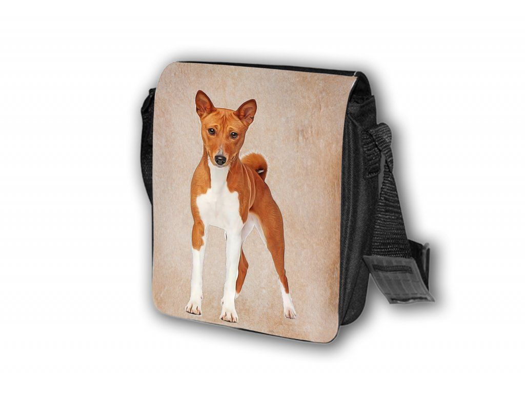 Nylonová vycházková taška s popruhem přes rameno, černé barvy. Velikost tašky je 21x20 cm. Na omyvatelné, odnímatelné ploše velikosti 17x20 cm je krásný paint potisk Basenji.