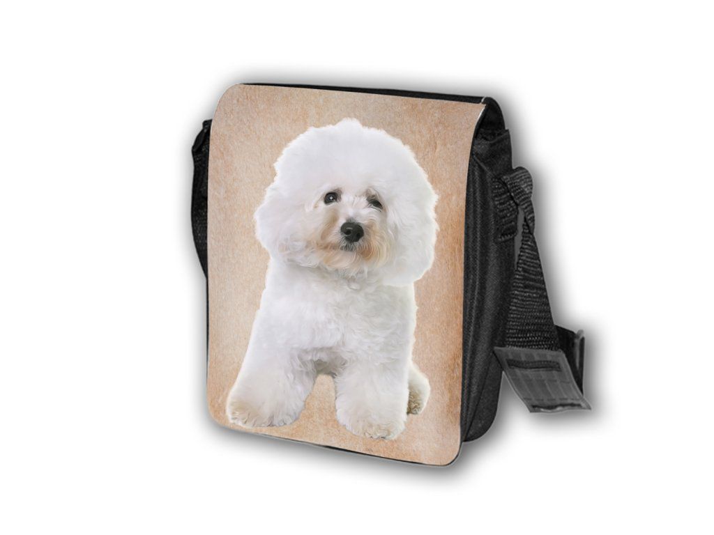 Nylonová vycházková taška s popruhem přes rameno, černé barvy. Velikost tašky je 21x20 cm. Na omyvatelné, odnímatelné ploše velikosti 17x20 cm je krásný paint potisk Bišonek.