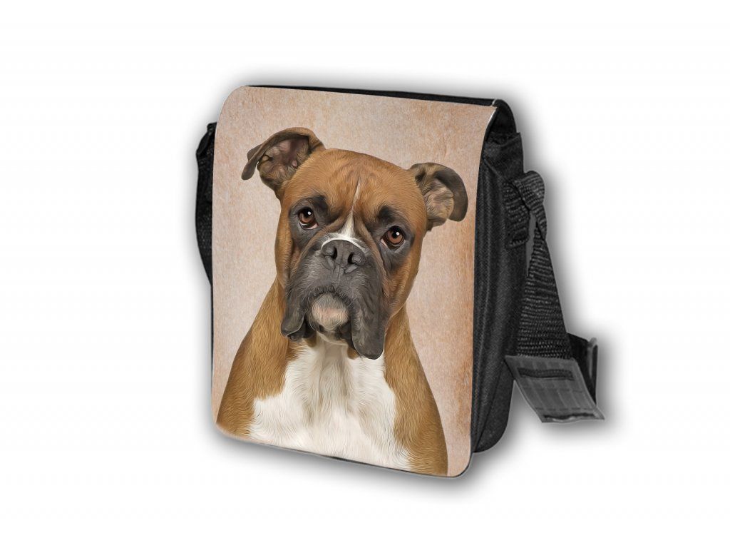 Nylonová vycházková taška s popruhem přes rameno, černé barvy. Velikost tašky je 21x20 cm. Na omyvatelné, odnímatelné ploše velikosti 17x20 cm je krásný paint potisk Boxer .