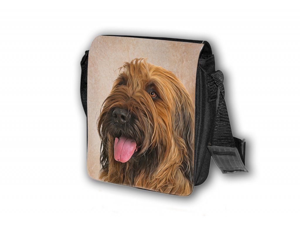 Nylonová vycházková taška s popruhem přes rameno, černé barvy. Velikost tašky je 21x20 cm. Na omyvatelné, odnímatelné ploše velikosti 17x20 cm je krásný paint potisk Briard.