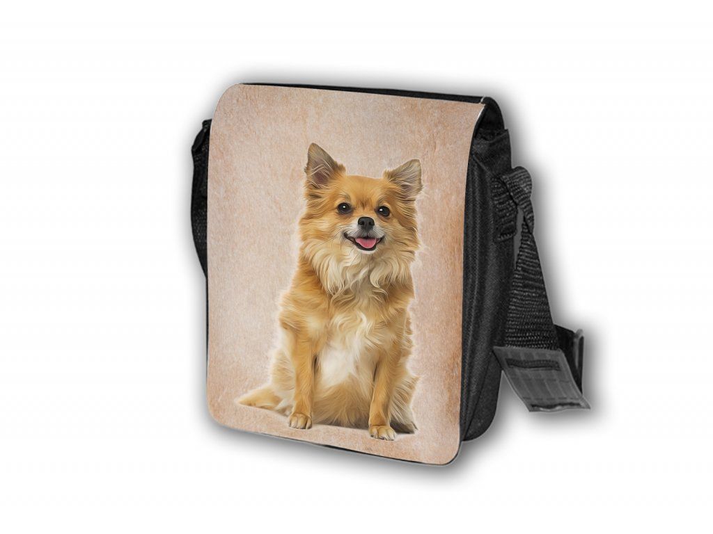 Nylonová vycházková taška s popruhem přes rameno, černé barvy. Velikost tašky je 21x20 cm. Na omyvatelné, odnímatelné ploše velikosti 17x20 cm je krásný paint potisk Čivava II.