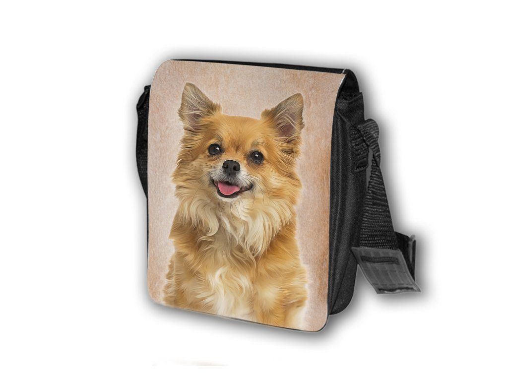 Nylonová vycházková taška s popruhem přes rameno, černé barvy. Velikost tašky je 21x20 cm. Na omyvatelné, odnímatelné ploše velikosti 17x20 cm je krásný paint potisk Čivava VI.