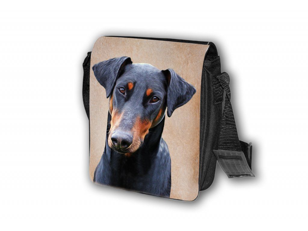 Nylonová vycházková taška s popruhem přes rameno, černé barvy. Velikost tašky je 21x20 cm. Na omyvatelné, odnímatelné ploše velikosti 17x20 cm je krásný paint potisk Dobrman.